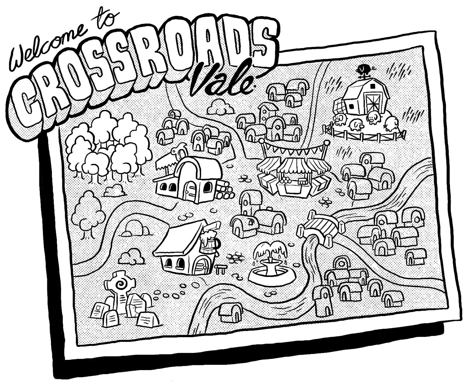 Cursed Calamity at Crossroads Vale is an adventure for old-school fantasy roleplaying games featuring a cursed hoard of magical items unleashed upon the unsuspecting Crossroads Vale, a prosperous trading town. The adventure is meant for 1st and 2nd level characters, as players assume the roles of the townsfolk forced to deal with the fallout of a dragon’s cursed treasure.