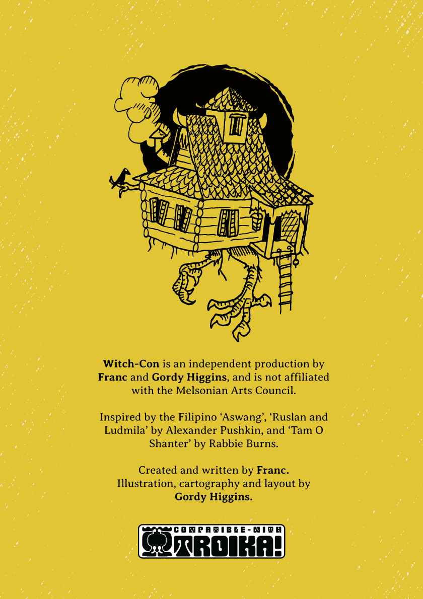 Inspiration for Witch-Con is taken from works such as Ruslan and Ludmila by Alexander Pushkin, various British folk-tales, The Witches by Roald Dahl, and Demon Driven To The Maw by Brad Kerr.